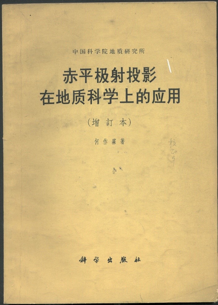 “極射赤平投影”不僅是研究巖組學(xué)的重要工具,而且也是地質(zhì)構(gòu)造研究方面的方法典范,在地質(zhì)學(xué)上廣泛應(yīng)用。何作霖是我國(guó)第一個(gè)對(duì)該方法在地質(zhì)科學(xué)上應(yīng)用做綜合闡述者。他集多年的理論研究、科研實(shí)踐及各國(guó)零散資料撰寫(xiě)出版了《赤平極射投影在地質(zhì)科學(xué)中的應(yīng)用》(科學(xué)出版社,1958)一書(shū),深受巖礦工作者喜歡,后又多次再版。這是世界上第一部這方面的專(zhuān)著,也是中國(guó)構(gòu)造地質(zhì)學(xué)和巖石礦物學(xué)工作者長(zhǎng)期必讀的重要工具書(shū)。