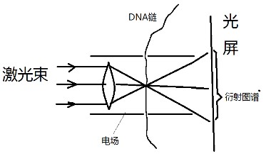 測序流程:合成一段已知序列的單鏈DNA,要求含有全部A G C T四種核苷酸。在脈沖電場作用下,這段已知序列的帶負電的DNA單鏈被拉直并一堿基一堿基的通過納米孔,每通過一個堿基便會出現數微秒的停頓。低能超細高頻激光束經過聚焦,在焦點處與剛剛經過納米孔的DNA單鏈相遇,經過衍射,在另一側的光屏上形成衍射圖譜,由于DNA單鏈的間續(xù)性運動,會產生間續(xù)性衍射圖譜,以衍射圖譜與DNA序列作對比,可以得出每種圖譜對應的堿基。