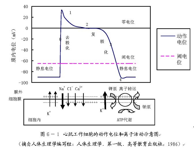 在上圖中,去極化(0期),心肌細(xì)胞受刺激后,靜息電位到達(dá)閾電位時(shí),迅速激活鈉通道,使其開(kāi)放,造成大量鈉離子內(nèi)流,動(dòng)作電位迅速升高,鈉通道又迅速失活關(guān)閉;快速?gòu)?fù)極化初期(1期),鈉離子內(nèi)流停止,氯離子通透性升高,氯離子內(nèi)流,氯離子通道通透性也迅速下降;緩慢復(fù)極化期(2期),鈣離子緩慢內(nèi)流,與此同時(shí),少量鉀離子外流,鈣離子通道的激活和失活過(guò)程均緩慢,故稱慢通道;快速?gòu)?fù)極化末期(3期),鉀離子外流;靜息期(4期),此期離子轉(zhuǎn)運(yùn)活躍,即把動(dòng)作電位形成期間流入膜內(nèi)的鈉離子,氯離子,鈣離子排出,又把外流的鉀離子攝回,這一過(guò)程通過(guò)心肌細(xì)胞膜上的Na+-K+泵的作用完成的,需要消耗ATP的生理過(guò)程。(本小節(jié)內(nèi)容摘自人體生理學(xué)編寫組:人體生理學(xué).第一版.高等教育出版社,1986)