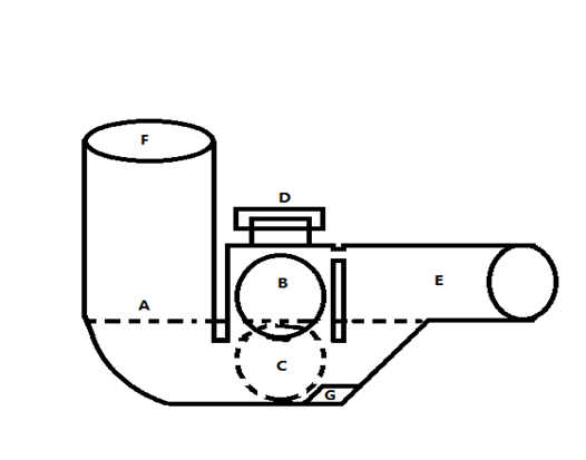 排水管的設(shè)計(jì)(如圖):本設(shè)計(jì)是在U型管道的基礎(chǔ)上增加固體阻斷機(jī)構(gòu)(球形、圓柱形等多種形體),當(dāng)U型管道中填充一定量的水時(shí),機(jī)構(gòu)內(nèi)的阻斷球就會(huì)在浮力的作用下,處于完全開放的狀態(tài),當(dāng)U型管道內(nèi)的水因得不到及時(shí)補(bǔ)充而氣化,這時(shí),B球體在重力作用下,隨著管內(nèi)水位下降而下落。在管道底部、球體下落方向增設(shè)斜面,增加球體下落壓力,增加球體密封效果。當(dāng)管道內(nèi)補(bǔ)充一定的水量時(shí),球體的水的浮力作用下,上浮到B區(qū),保持管道通暢。從而達(dá)到有效阻止有害物質(zhì)回流的目的。