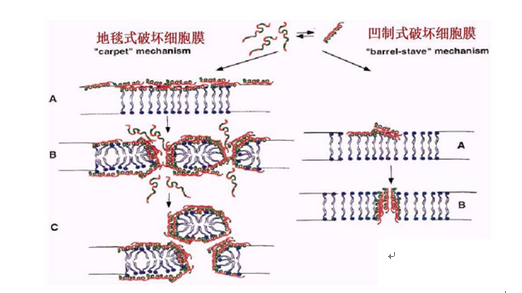 防御素抗菌的作用機理,目前有兩種不同的抗菌作用機理被提出,一種是獨立膜機制,另一種是防御素結合細胞內復合物的機制。獨立膜機制的觀點認為, 帶正電荷的防御素與帶負電荷的細菌細胞膜相互吸引,并相互結合,從而破壞了磷脂雙分子層的完整性,引起靶細胞膜出現(xiàn)裂隙??煞譃槿齻€階段:(1)由靜電吸引。防御素與靶細胞膜結合。防御素帶正電荷,可通過靜電作用與帶負電荷的細菌膜脂層結合;(2)通道形成。帶正電荷的防御素分子或其多聚體則與細菌質膜上帶負電荷的磷脂頭部和水分子相互作用,顯著地增加生物膜的通透性。防御素作用于膜上形成穩(wěn)定的多個通道;(3)內容物外泄。通道形成后,防御素進入細胞內的同時,其他胞外分子也伴隨進入(如肽、蛋白質或無機離子),而靶細胞的重要物質(如鹽離子和大分子)滲出,細胞膜的通透性及細胞能量狀態(tài)受到了破壞,導致細胞膜去極化,呼吸作用受到抑制以及細胞ATP含量下降, 離子和大分子物質通過細菌的細胞膜, 最終導致靶細胞死亡。
