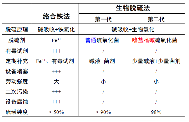 經過中試連續(xù)運行我們發(fā)現嗜鹽嗜堿硫氧化脫硫體系相比傳統絡合鐵法具有明顯的優(yōu)勢:極端微生物可耐受的環(huán)境優(yōu)勢更為突出,僅需定期補充堿液及少量菌劑就可保證整個系統連續(xù)運轉,勞動強度小,且系統回收單質硫磺的純度高達98%。更多內容見下表。