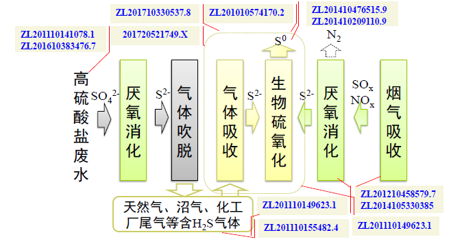 基于嗜鹽嗜堿硫氧化菌開發(fā)氣體生物脫硫及硫回收工藝,我們將其在高硫酸鹽廢水和煙氣脫硫脫硝中進行應用,并對關鍵流程的知識產權進行了全面布局(圖1-8)。