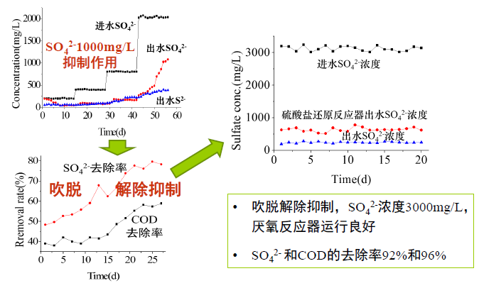 硫化氫對厭氧消化的抑制一直是影響處理效果的重要因素,我們采用載氣將硫化氫吹脫,降低其對產甲烷菌活性的抑制,發(fā)現經吹脫后硫酸鹽去除率明顯增高,提高了厭氧消化反應效率(圖1-10)。