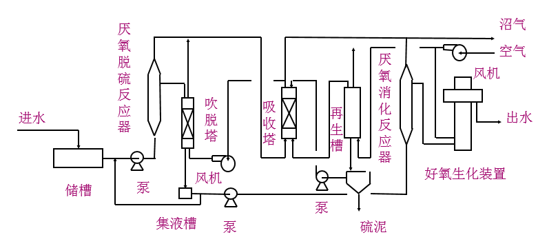 在高硫酸鹽廢水處理集成系統中,首先硫化氫先經過吹脫處理,降低硫化氫對后續(xù)反應中對厭氧反應的抑制。經吹脫過的廢水進入厭氧硫酸鹽還原反應器,進行一系列后續(xù)高效的硝化與反硝化處理,最終出水達標排放(圖1-9)。