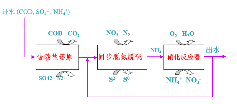在通常條件下含硫工業(yè)廢水中同時含有大量的氮素,高含硫含氮也是制藥生產廢水的另一主要特征。隨著生物脫硫技術與生物脫氮技術的發(fā)展,通過研究碳氮硫共代謝體系,硫酸鹽的還原產物的生物氧化過程與含氮污染物反硝化過程,相互間的作用關系,提出了碳氮硫共脫除體系。