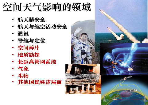 太陽上出現(xiàn)的耀斑和日冕物質(zhì)的拋射等劇烈活動,給地球磁層,電離層和中高層大氣,衛(wèi)星運行和安全,以及人類健康,帶來嚴(yán)重影響和危害,通訊也會受到損害。人們把這種由太陽活動引起的短時間尺度的變化,稱之為空間天氣(大于30公里)。