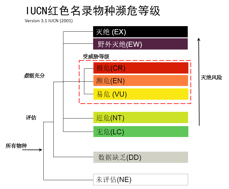 IUCN自20世紀(jì)60年代成立之日起,就設(shè)立了物種生存委員會(huì)(SSC),開始編制和印刷《IUCN瀕危物種紅皮書》,后來隨著評(píng)估物種的增加,印刷版逐步發(fā)展為網(wǎng)絡(luò)版的《IUCN瀕危物種紅色名錄》,定期編制發(fā)布。IUCN/SSC研究制定了《IUCN物種紅色名錄瀕危等級(jí)和標(biāo)準(zhǔn)》,根據(jù)物種的種群數(shù)量和分布情況等,評(píng)估其生存狀況,確定其瀕危等級(jí)。IUCN瀕危物種等級(jí)標(biāo)準(zhǔn)分為“有評(píng)估數(shù)據(jù)”和“數(shù)據(jù)缺乏”兩類,“有數(shù)據(jù)評(píng)估”中又分為“滅絕”、“野外滅絕”、“區(qū)域滅絕”、“極?!?、“瀕?!?、“易?!?、“近?!焙汀盁o?!钡?個(gè)級(jí)別,從“無?!钡健皹O?!保瑴缃^風(fēng)險(xiǎn)逐步上升,瀕危等級(jí)逐步增加。瀕危等級(jí)標(biāo)準(zhǔn)有5個(gè)指標(biāo),分別是種群下降、有限地理分布區(qū)、下降小種群、非常小或非常有限的種群、以及模型模擬等量化分析,根據(jù)這些指標(biāo)的數(shù)量閾值,來評(píng)估物種的瀕危等級(jí)。