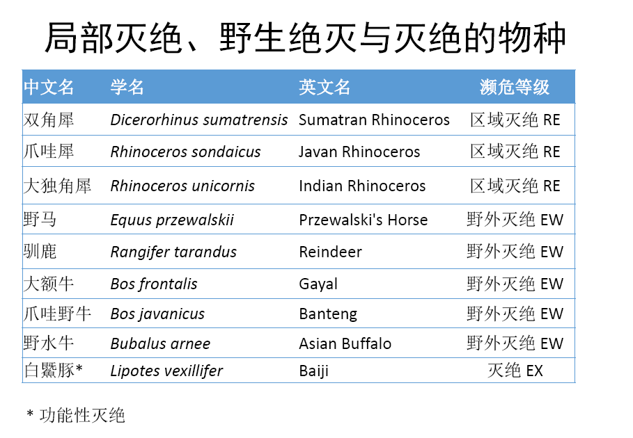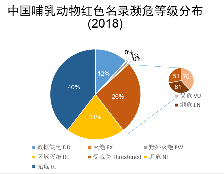 此外,我們對(duì)中國哺乳動(dòng)物多樣性進(jìn)行編目,分別于2015年和2017年完成了第一版和第二版,第一版中,我們收錄了673種哺乳動(dòng)物,第二版中我們刪除了一些不存在的物種如倭巖羊,并增添了一些物種,主要是分布在藏南的一些物種,共收錄了693種哺乳動(dòng)物,使得我國的哺乳動(dòng)物總數(shù)位列全球首位。2015年發(fā)布《中國生物多樣性紅色名錄-脊椎動(dòng)物卷》后,2018年又對(duì)該紅色名錄等級(jí)進(jìn)行了更新,哺乳動(dòng)物的情況來看,最新的評(píng)估結(jié)果中,受威脅的物種占26%、近危21%,無危40%,數(shù)據(jù)缺乏12%,其中有多個(gè)物種已經(jīng)區(qū)域滅絕、野外滅絕或功能性滅絕。部分中國特有的哺乳動(dòng)物,中國生物多樣性紅色名錄和IUCN紅色名錄的評(píng)估結(jié)果,由于評(píng)估信息的不同,結(jié)果也有所不同,如白鱀豚、長江江豚等;還有一些哺乳動(dòng)物由于并非中國特有,所以中國生物多樣性紅色名錄和IUCN紅色名錄評(píng)估等級(jí)有所不同,如野馬、賽加羚羊、麋鹿、蒙原羚、河貍等。