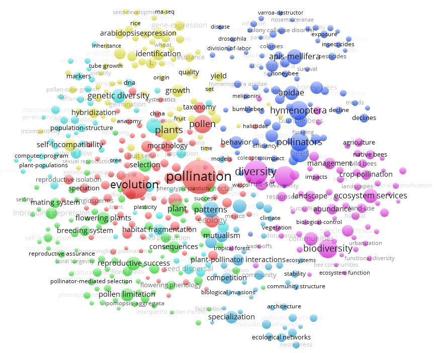 與此同時我們還通過ESI對pollination和pollinator等關(guān)鍵詞進(jìn)行檢索,可以大致得出傳粉昆蟲研究領(lǐng)域的現(xiàn)有研究前沿如下:1)常用新煙堿類殺蟲劑對蜜蜂的殺傷作用;2)野生授粉昆蟲對農(nóng)業(yè)增收和作物健康的積極影響;3)傳粉昆蟲種群測量與評估;4)花朵與傳粉昆蟲的生態(tài)聯(lián)系。通過利用Vos Viewer軟件繪制傳粉生物學(xué)關(guān)鍵詞共現(xiàn)(co-occurrence)聚類圖,獲得傳粉生物學(xué)領(lǐng)域的研究熱點(diǎn)包括:1)傳粉昆蟲的形態(tài)學(xué)、系統(tǒng)進(jìn)化、分類學(xué)方面的研究;2)傳粉昆蟲介導(dǎo)的植物繁殖、選育、選種等的研究,以及花粉限制對傳粉昆蟲的影響;3)殺蟲劑導(dǎo)致傳粉昆蟲,尤其是蜜蜂、熊蜂的種群下降的影響;4)傳粉昆蟲介導(dǎo)的植物基因表達(dá)、生長、增產(chǎn)等;5)景觀變化、城市化等環(huán)境因素導(dǎo)致生物多樣性降低、傳粉服務(wù)功能下降、傳粉昆蟲群體數(shù)量下降等影響評估,并提出相關(guān)的控制與管理措施;6)植物-傳粉昆蟲互作與共生、植物與傳粉昆蟲形成的生態(tài)網(wǎng)絡(luò)結(jié)構(gòu)等方面的研究;7)傳粉使植物基因流擴(kuò)散,使植物基因變異和多樣性。