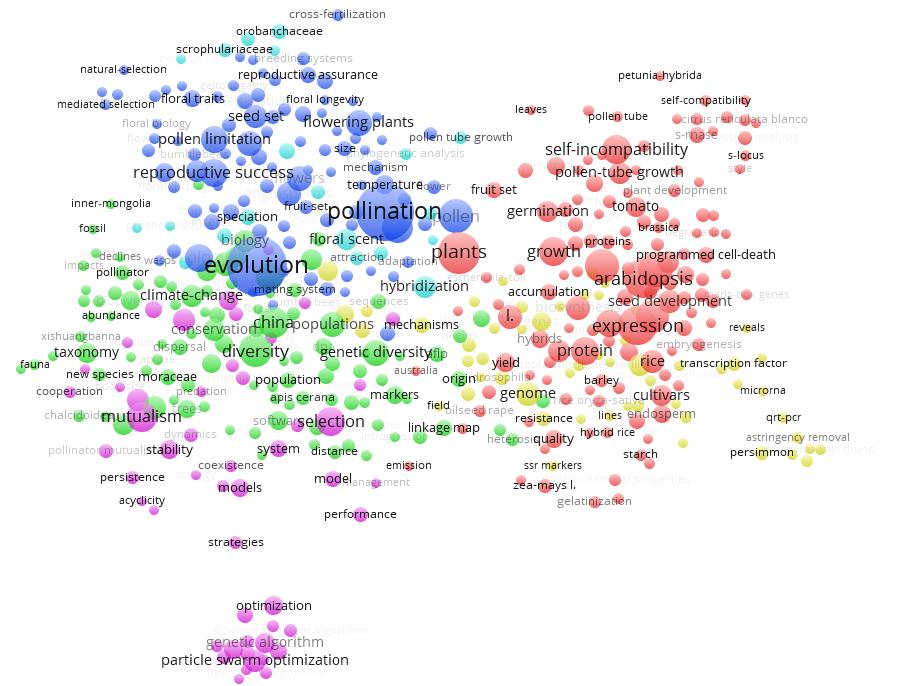 利用Vos Viewer軟件分析2013-2017年中國傳粉生物學(xué)領(lǐng)域的SCI論文,獲得中國傳粉生物學(xué)領(lǐng)域的研究熱點(diǎn)是:1)植物花粉管生長、發(fā)育等分子、細(xì)胞層面基礎(chǔ)機(jī)制研究;2)傳粉昆蟲的分類學(xué)研究,及其遺傳多樣性、保護(hù)、種群擴(kuò)散等方面的研究;3)昆蟲傳粉在植物遺傳育種、進(jìn)化中發(fā)揮重要作用;4)與傳粉相關(guān)的植物轉(zhuǎn)錄因子、microRNA、殺蟲劑耐藥性等方面的研究;5)傳粉昆蟲的種群優(yōu)化、傳粉昆蟲互作等方面的研究。