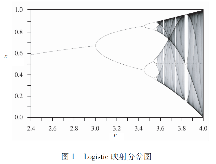 首先給大家介紹一下非線性動(dòng)力學(xué)的基本概念。考慮到在座的大多是等離子體方面的專家,對非線性動(dòng)力學(xué)不太熟悉,因此我就從最簡單的離散映射系統(tǒng)開始為大家進(jìn)行介紹。這個(gè)映射系統(tǒng)雖然看起來非常簡單,但足以讓大家比較好地理解非線性動(dòng)力學(xué)的基本概念。Logistic映射數(shù)學(xué)表達(dá)式是xn+1=rxn(1-xn),它是非線性動(dòng)力學(xué)里非常基礎(chǔ)的一個(gè)例子。盡管Logistic映射看起來很簡單,但它已經(jīng)是一個(gè)動(dòng)力學(xué)系統(tǒng),即它的狀態(tài)變量是隨時(shí)間演化的。對于我們現(xiàn)在討論的Logistic映射,比如說第n步是xn,那第n+1步是什么呢?很簡單,由映射關(guān)系就可以得到xn+1。我們來觀察它隨時(shí)間會(huì)如何演化,比如說從x0開始,迭代第一步得到x1,再得到x2,一直迭代下去我們最終可以觀察到映射的穩(wěn)態(tài)結(jié)果,那我們究竟可以觀察到什么樣的穩(wěn)態(tài)行為呢?這其實(shí)就是非線性動(dòng)力學(xué)研究的一個(gè)主要內(nèi)容。我們來看這么一個(gè)簡單的Logistic映射,圖1給出了它的分岔圖。顯然,映射最終的穩(wěn)態(tài)行為是與映射的參數(shù)有關(guān)系的,通過圖1的分岔圖我們就可以觀察映射在各個(gè)參數(shù)下的穩(wěn)態(tài)行為。