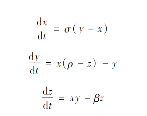 剛才講的Logistic映射是一個(gè)離散動(dòng)力系統(tǒng),下面給出一個(gè)連續(xù)動(dòng)力系統(tǒng)的例子,該系統(tǒng)非常有名,叫作洛倫茲系統(tǒng),是1969年洛倫茲在研究氣象模型時(shí)提出的:
