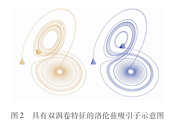 洛倫茲系統(tǒng)其實(shí)就是一個(gè)簡單的三維自治ODE方程組,洛倫茲發(fā)現(xiàn)在某些參數(shù)下該系統(tǒng)會(huì)出現(xiàn)混沌行為。圖2給出了洛倫茲系統(tǒng)具有雙渦卷特征的混沌吸引子相圖,注意其軌道是永不重復(fù)的。