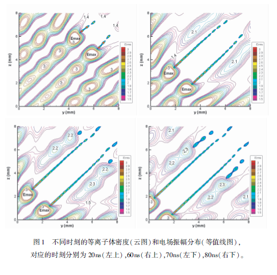 下面看一下相交微波束大氣擊穿的模擬結(jié)果,我們首先算了同頻率微波相交的情況,此時(shí)相干疊加之后,由于干涉作用,會(huì)形成電場強(qiáng)度強(qiáng)弱分布。我們首先模擬一下種子電子在弱場區(qū)的情況。因?yàn)樵诖髿庵蟹N子電子是偶然出現(xiàn)的,有可能出現(xiàn)弱場區(qū),如果出現(xiàn)在弱場區(qū),它需要擴(kuò)散,擴(kuò)散到強(qiáng)場區(qū)之后電子碰撞分子發(fā)生雪崩電離,形成的等離子體沿著強(qiáng)場區(qū)做趨源運(yùn)動(dòng),運(yùn)動(dòng)方向沿著)=:的這條線。形成的等離子體的區(qū)域是一個(gè)等離子體絲帶,當(dāng)然如果把氣壓降低,會(huì)發(fā)現(xiàn)絲帶就會(huì)過渡為一個(gè)等離子體帶。圖1給了幾個(gè)典型時(shí)刻的等離子體密度分布和場強(qiáng)的分布,在20ns的時(shí)候,由于靠近等離子體區(qū)域最強(qiáng)的場是沿著)=:這條線的,當(dāng)?shù)入x子體絲帶長度增加到一定程度的時(shí)候,在其左上和右下區(qū)域,相當(dāng)于把兩個(gè)微波場隔開,這兩個(gè)區(qū)域相當(dāng)于只有一個(gè)單微波的作用,在兩邊有新的等離子體絲帶。如果初始電子出現(xiàn)在強(qiáng)場區(qū),電子碰撞分子就會(huì)雪崩電離,形成等離子體。等離子體區(qū)域也是沿著J=:這條線做趨源運(yùn)動(dòng)。下面簡單比較了同頻和非同頻微波相交的大氣擊穿,同頻相當(dāng)于相干疊加,非同頻相當(dāng)于非相干疊加,模擬時(shí)間都是80ns,初始的種子電子數(shù)都一樣,可以發(fā)現(xiàn)在相干的情況下,即使把種子電子源放到場強(qiáng)最小的地方,產(chǎn)生等離子體的區(qū)域也大于非相干的情況,而且產(chǎn)生的最大電子數(shù)也是大于非相干的情況??偨Y(jié)主要有三點(diǎn),一個(gè)是區(qū)域隨壓強(qiáng)的變化,還有等離子體做趨源運(yùn)動(dòng),還有相干比非相干的等離子體區(qū)域比較大。