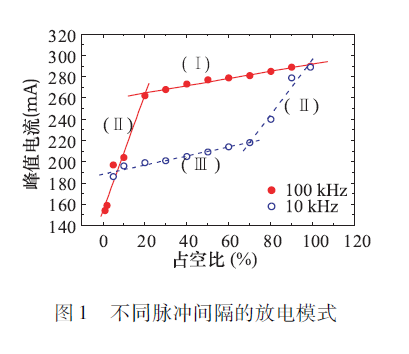 如果兩個(gè)脈沖間隔比較近,那么跟連續(xù)就沒什么差異,因?yàn)槊}沖撤銷以后,即射頻消失以后,電極間還存在的空間電荷,也就是有電子和離子分離存在,這些電子在第二脈沖上來后就會(huì)參與放電,這時(shí)與連續(xù)放電差異性就不大了。如果脈沖間隔范圍足夠?qū)挘@就成為兩個(gè)不同的放電,兩個(gè)放電之間是不相關(guān)的。如圖1( I)是脈沖之間間隔非常小的時(shí)候,稱為連續(xù)模式;下面的Ⅲ是脈沖之間間隔非常大的時(shí)候,稱為分離模式,我們可以看到整個(gè)放電的峰值電流要小不少。在它們之間,(II)稱為傳輸模式,在兩個(gè)脈沖之間,電子沒有完全消亡的情況下放電電流與占空比的關(guān)系。共有上述三個(gè)過程,可見脈沖的間隔長短對放電的影響不是由占空比決定,主要是考慮電極之間間距和里面所參與的空間電荷分布變化。