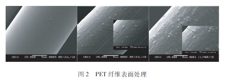 用長50cm、間距5cm的電極板做了一個(gè)射頻的放電模式。我們用上面介紹的JET做了滅菌實(shí)驗(yàn),細(xì)菌的存活數(shù)量得到了有效的下降。在這里主要看一下對化纖的處理效果,圖2的左圖是沒有處理過的,中圖是200 W處理的,右圖是800 W處理的。這兩個(gè)之間有什么區(qū)別呢?中圖顯示纖維表面有溝槽出來,這任何化纖在等離子體處理情況下刻蝕的一個(gè)特征,在低真空情況下的射頻放電都會(huì)有溝槽刻蝕出來。但是在大氣壓輝光放電的情況下,表面有許多圓形體產(chǎn)生。我認(rèn)為不單純有刻蝕,而且有表面熔融的狀態(tài)出來。所以說,在大氣壓射頻放電對表面的作用是相當(dāng)強(qiáng)的。雖然每個(gè)脈沖時(shí)間比較短,但是它的作用非常強(qiáng)。